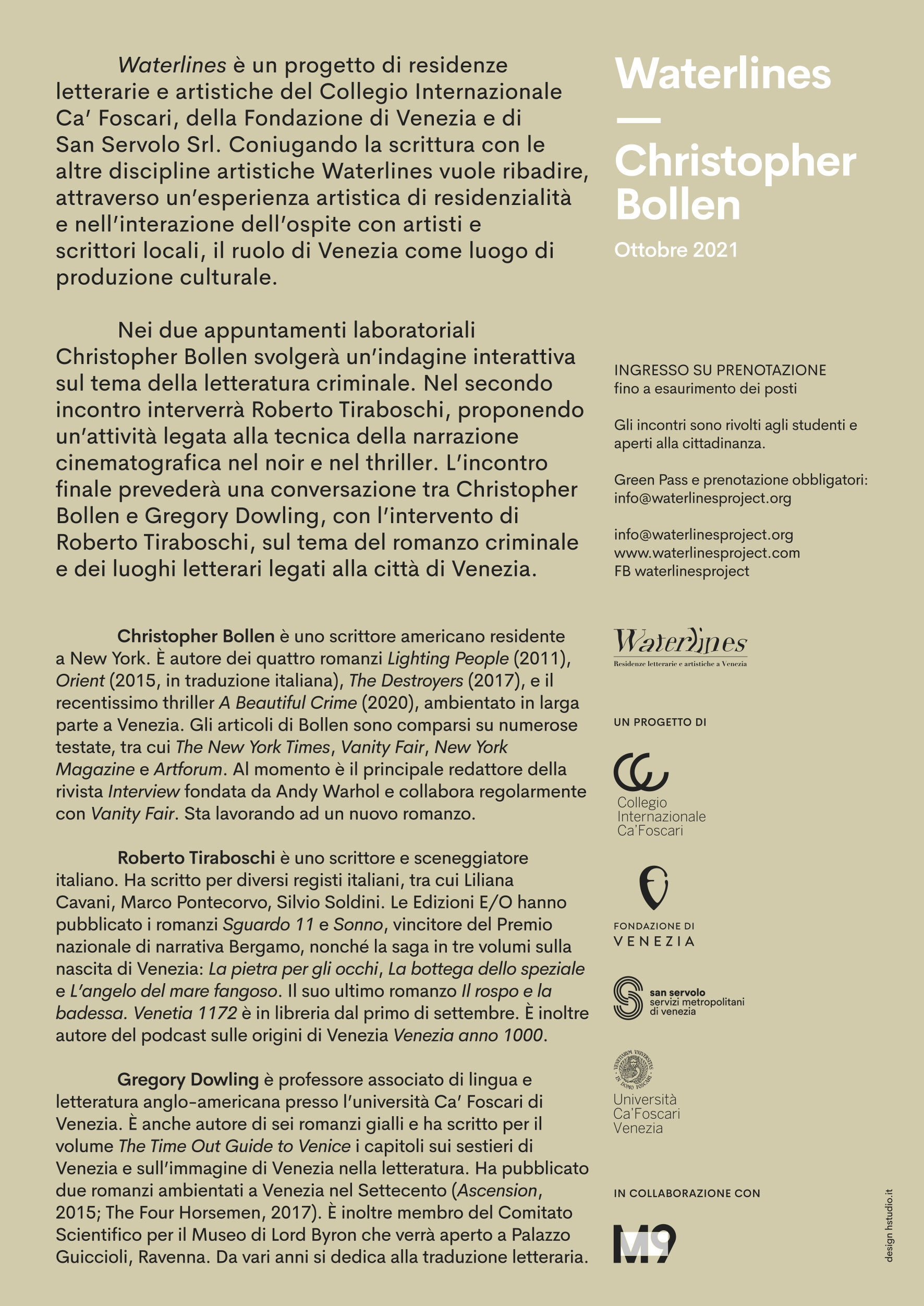 Roberto Tiraboschi (Bergamo, 1951) is an Italian author, screenwriter and playwright. He holds a degree in Letters from the University of Milan, as well as a degree in acting and directing from the Academy of Piccolo Teatro in Milan. He worked as a playwright and as a screenwriter before debuting as a novelist with his first book, “La levatrice di Thanatos” in 1995. He currently teaches Screenplay at the Experimental Cinematography Center and at the Ca’ Foscari University of Venice