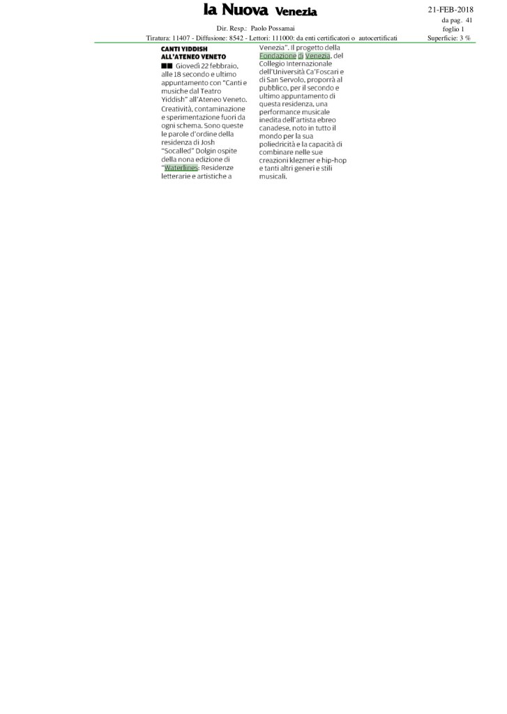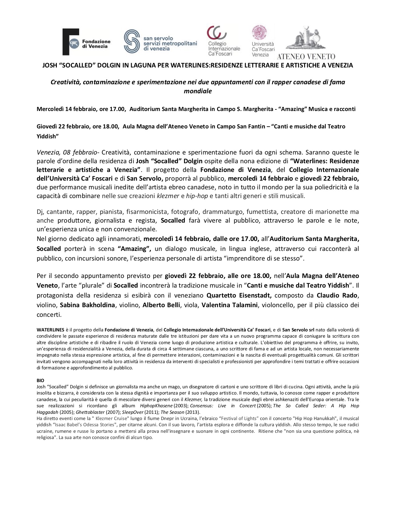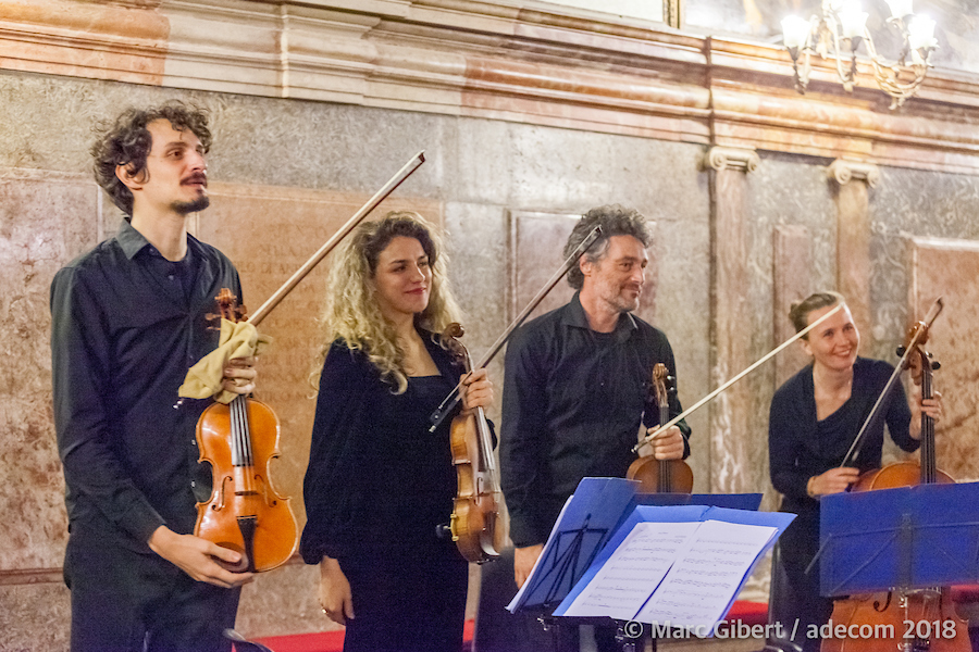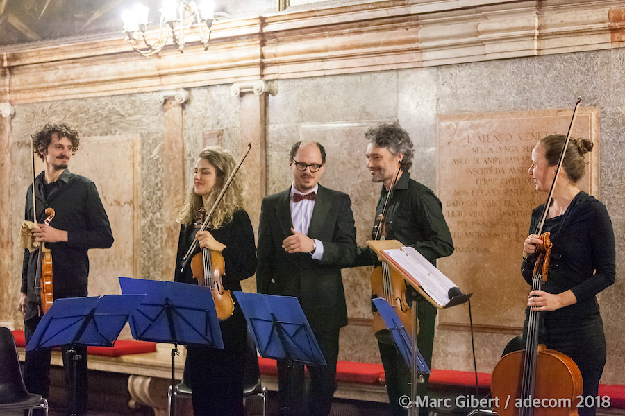Josh Socalled Dolgin lors de sa résidence à Venise pour son projet Waterlines, during his residence in Venice for his project Waterlines – Photographie © Marc Gibert / adecom.ca Josh Socalled Dolgin en concert avec le quartet Eisenstadt composé de Claudio Rado, violino – Sabina Bakholdina, violon – Alberto Belli, viola – Valentina Talamini, violoncello à Aula Magna, Ateneo Veneto San Marco 1897,